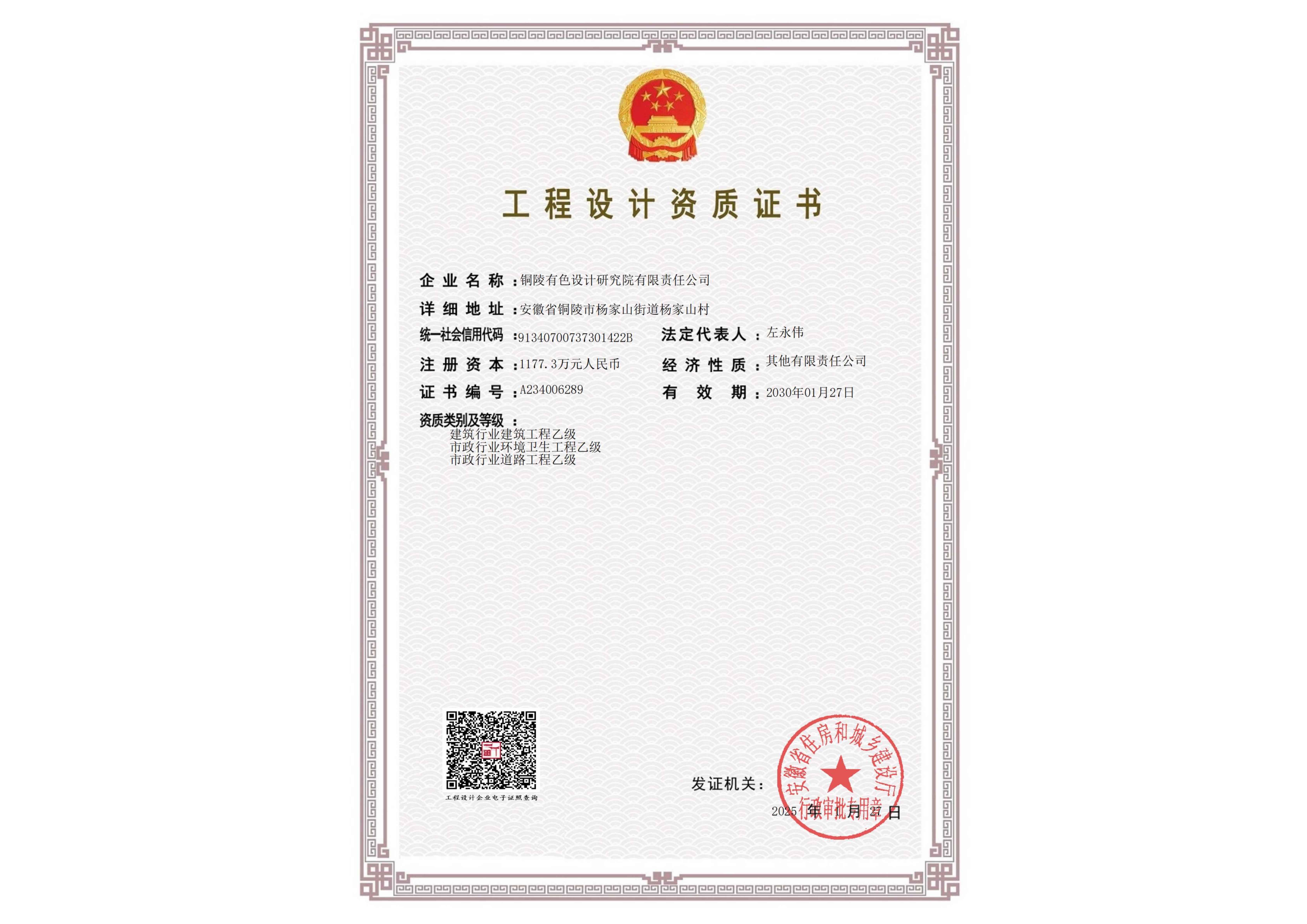 工程设计(冶金行业甲级)资质证书
